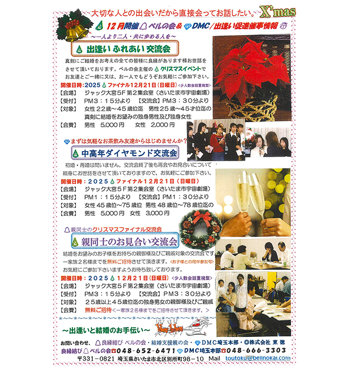初婚、再婚、中高年・シニア・シルバーの方々まで会員様の多種多様なご要望にお応えできますように会員様の年代、ご状況に合わせた交流会・イベントを毎月開催しております。