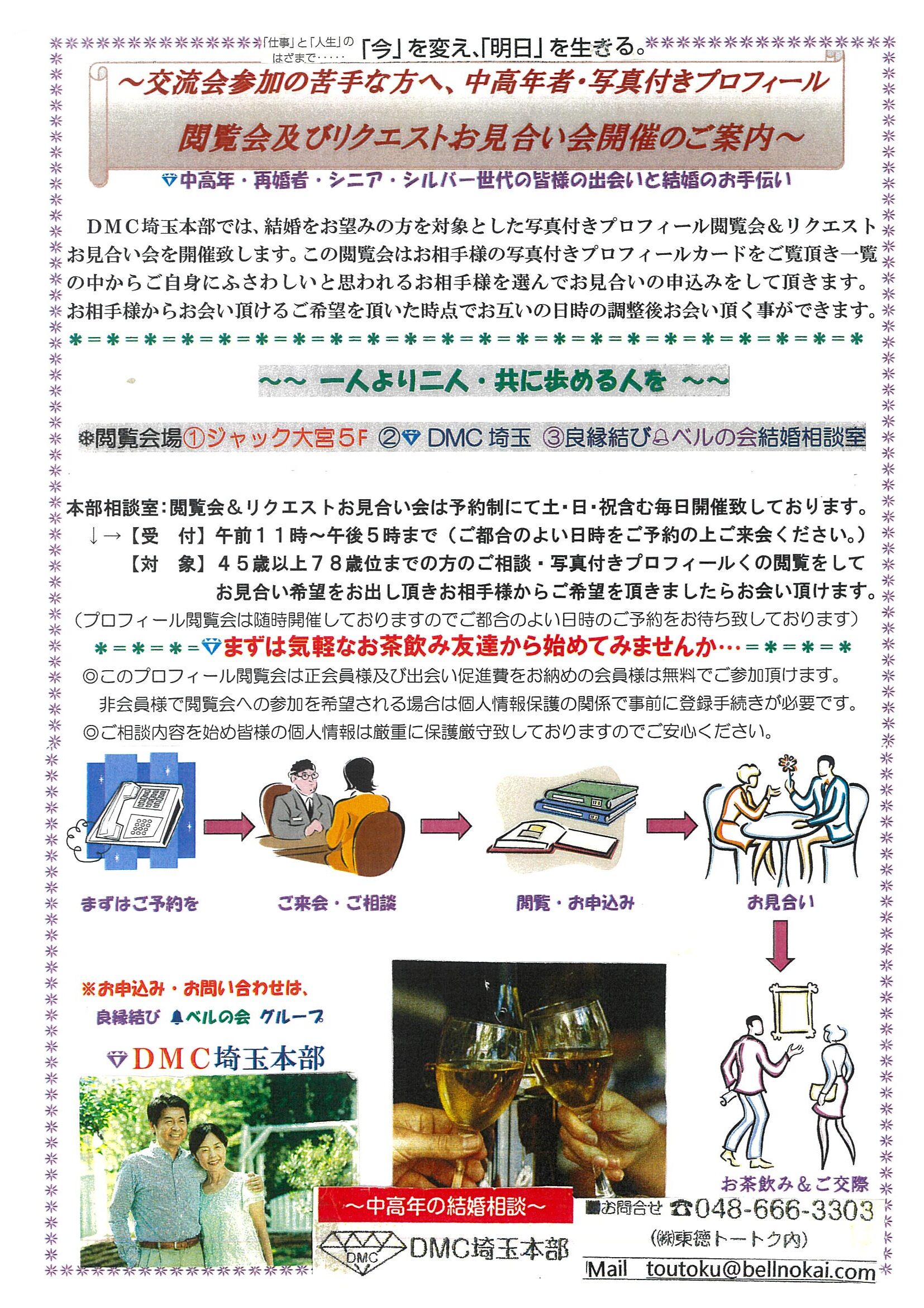 DMC埼玉本部では、結婚をお望みの方を対象とした写真付きプロフィール閲覧会&リクエストお見合い会を開催致します。