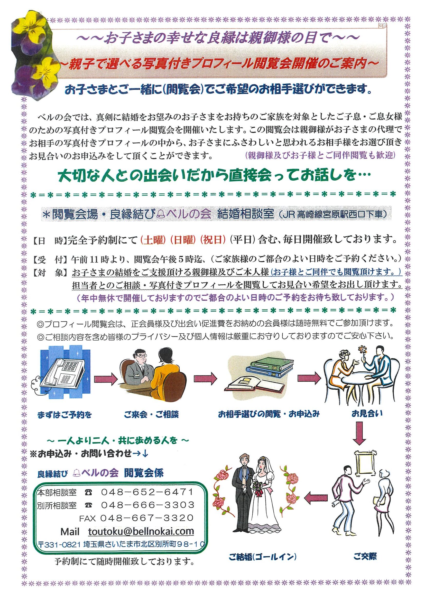 ベルの会では、真剣に結婚をお望みのお子さまをお持ちのご家族を対象としたご子息・ご息女様 *のための写真付きプロフィール閲覧会を開催いたします。