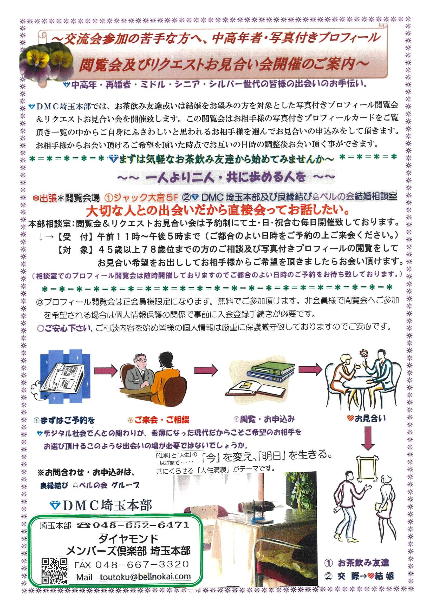 DMC埼玉本部では、結婚をお望みの方を対象とした写真付きプロフィール閲覧会&リクエストお見合い会を開催致します。