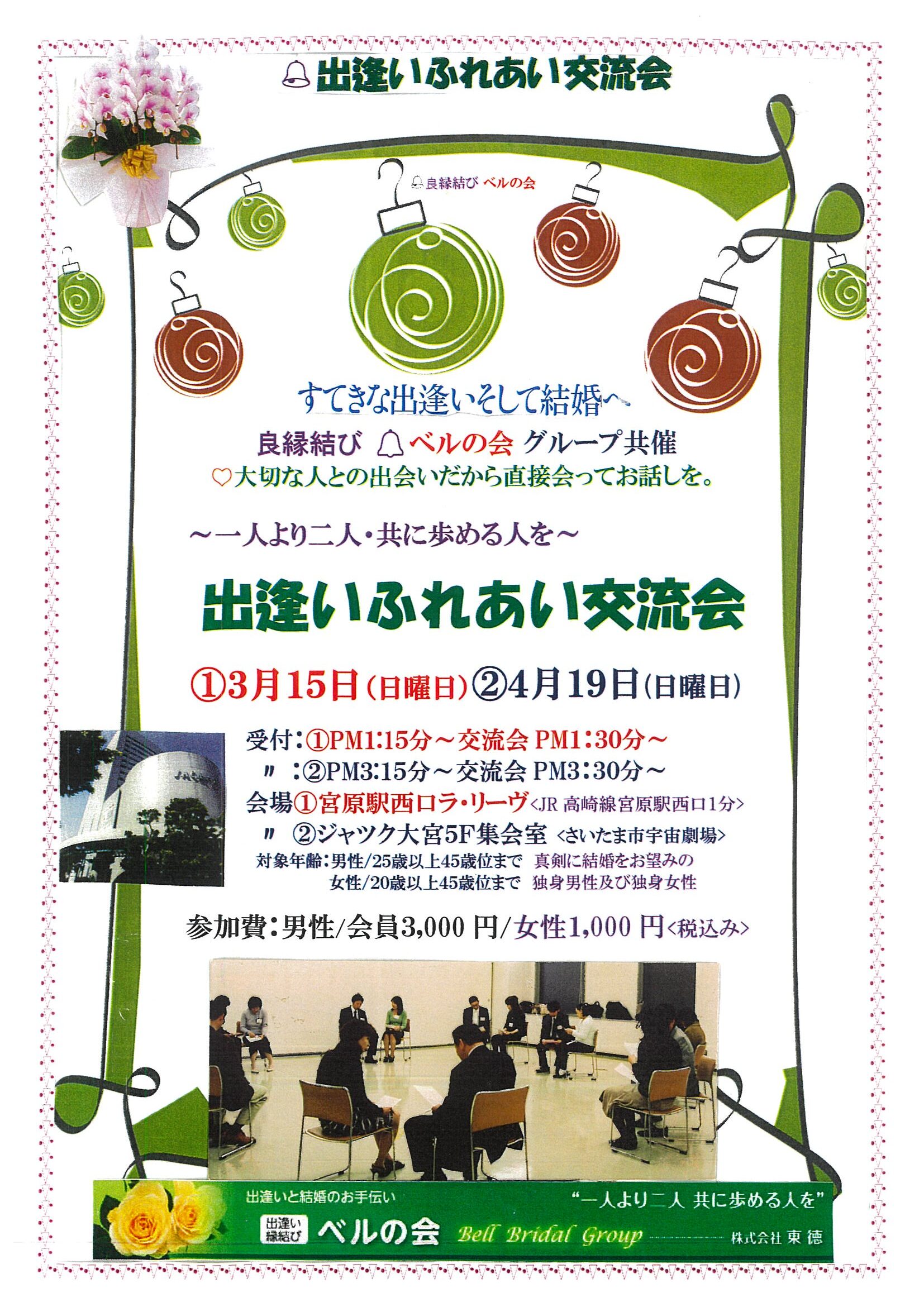 イベント・交流会・パーティー 出逢いふれあい交流会(2026年3月15日(日)・4月19日(日)開催) すてきな出逢いそして結婚へ 良縁結び、ベルの会グループ開催 大切な人との出会いだから直接会ってお話を 048-652-6471 お問い合わせ受付時間:9:00~21:00 定休日:土、日、祝含む年中無休(予約制)