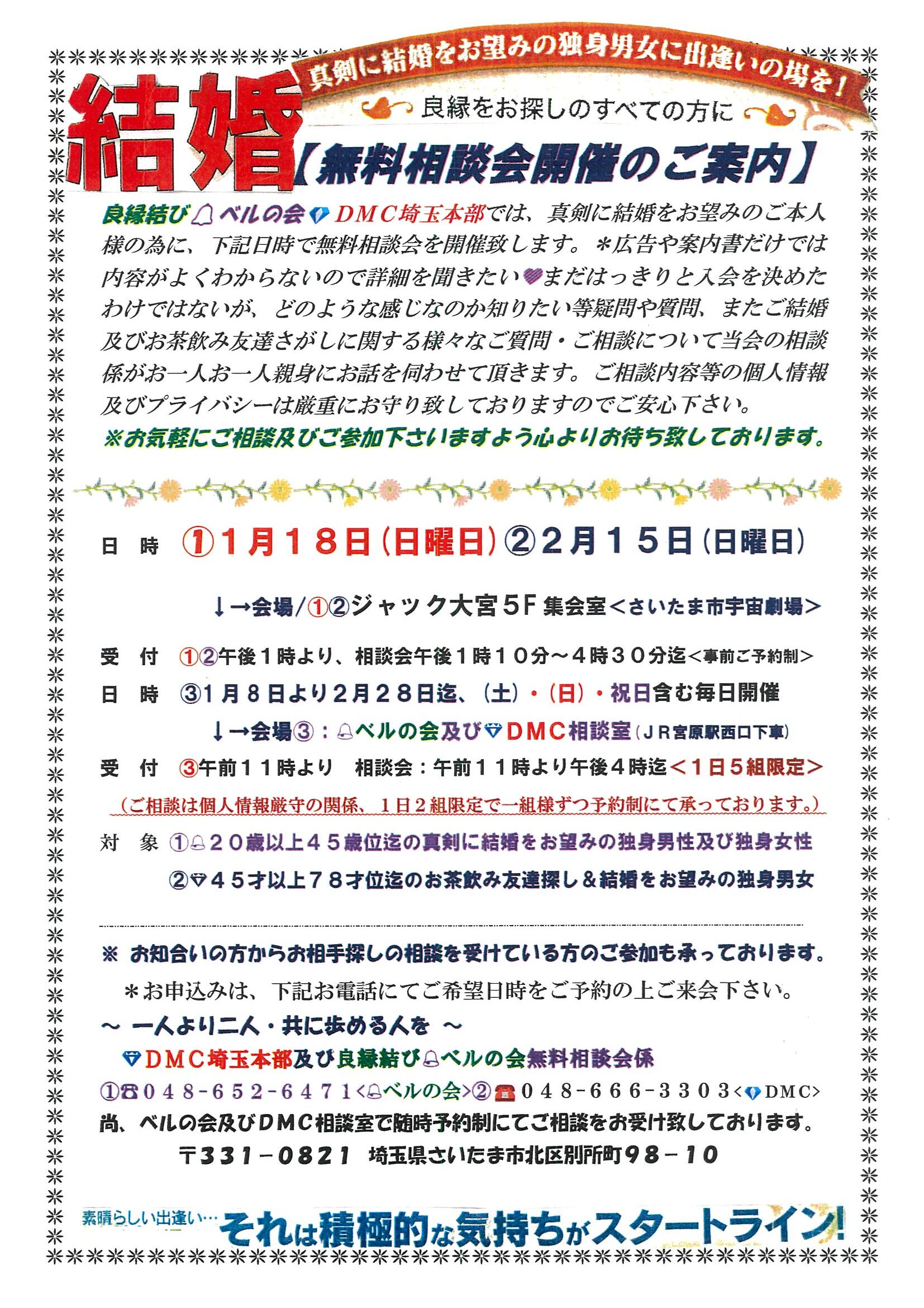 良縁結びベルの会では、真剣に結婚をお望みのご本人様及び親御様の為に、下記日程で無料相談会を開催いたします。